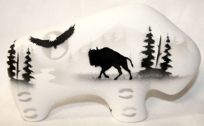 Soar with the eagle as he surveys majestic mountain peaks, meandering strems, conifer trees and wildlife. Sihoueetes of moose, wolf, bear, elk or buffalo are combined with their tracks that encircle the piece.