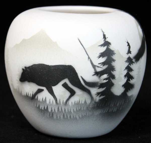 Soar with the eagle as he surveys majestic mountain peaks, meandering strems, conifer trees and wildlife. Sihoueetes of moose, wolf, bear, elk or buffalo are combined with their tracks that encircle the piece.