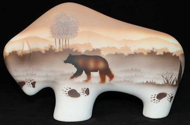 Enjoy a visit from the wildlife in the rolling backwoods. Silhouetes of buffalo, while tailed deer and black bear are combined with their tracks that encircle the piece.