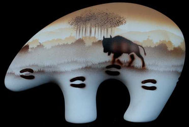 Enjoy a visit from the wildlife in the rolling backwoods. Silhouetes of buffalo, while tailed deer and black bear are combined with their tracks that encircle the piece.