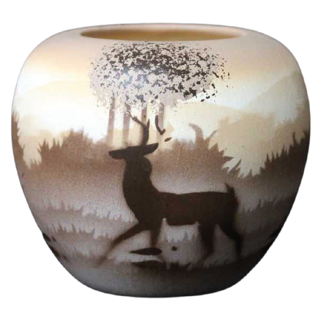 Enjoy a visit from the wildlife in the rolling backwoods. Silhouetes of buffalo, while tailed deer and black bear are combined with their tracks that encircle the piece.
