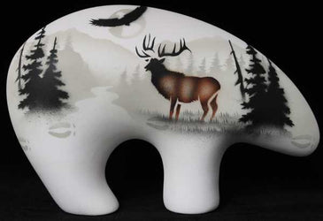 Soar with the eagle as he surveys majestic mountain peaks, meandering strems, conifer trees and wildlife. Sihoueetes of moose, wolf, bear, elk or buffalo are combined with their tracks that encircle the piece.