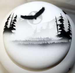 Soar with the eagle as he surveys majestic mountain peaks, meandering strems, conifer trees and wildlife. Sihoueetes of moose, wolf, bear, elk or buffalo are combined with their tracks that encircle the piece.