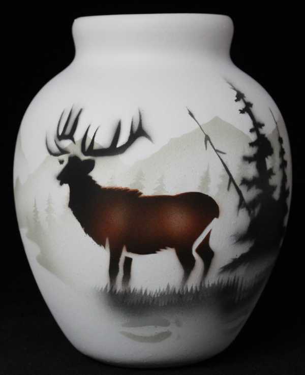 Soar with the eagle as he surveys majestic mountain peaks, meandering strems, conifer trees and wildlife. Sihoueetes of moose, wolf, bear, elk or buffalo are combined with their tracks that encircle the piece.