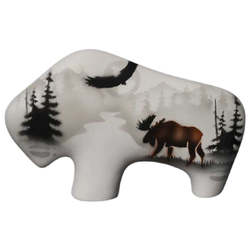 Soar with the eagle as he surveys majestic mountain peaks, meandering strems, conifer trees and wildlife. Sihoueetes of moose, wolf, bear, elk or buffalo are combined with their tracks that encircle the piece.